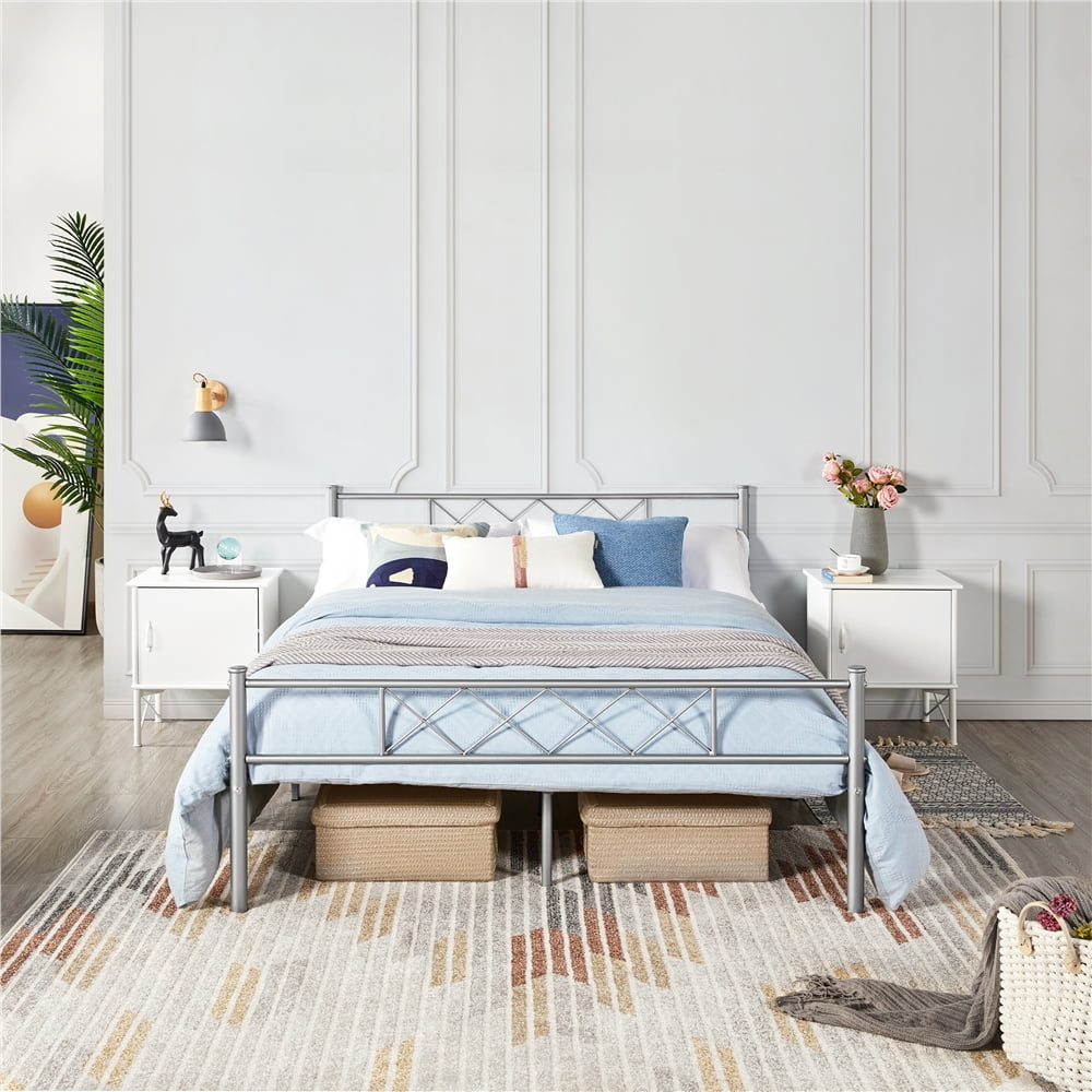 yaheetech queen size metal bed frame mattress foundation with headboard footboard slatted bed base silver walmart com walmart com