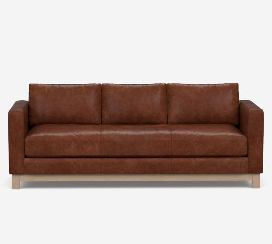 jake leather sofa wood base pottery barn